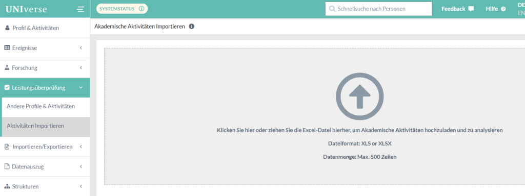 Melden Sie sich bei UNIverse an und navigieren Sie zum Modul Leistungsüberprüfung. Wählen Sie die Option „Aktivitäten importieren“ und Laden Sie die vorbereitete Excel-Datei hoch.